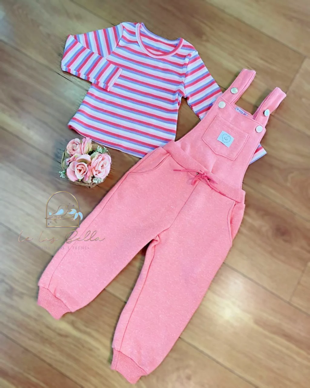 Conjunto Blusa e Jardineira Infantil Feminino Nina Go! A blusa confeccionada em ribana listrada fio tinto, com modelagem tradicional, decote arredondado e etiqueta decorativa da marca acima da barra. A jardineira confeccionada em moletom felpado botomix, alças com regulagem em botões personalizados, bolso funcional e ilhoses com cadarço decorativo. Look perfeito para sua pequena aproveitar todos os momentos nessa estação!